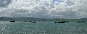 My second race was in the seniors event at Aberdyfi in July 2008. We were entered as Porthmadog supervets, which means the age of the 4 oarsmen had to add up to over 200. It was windy and the tide was ebbing. At the seaward part of the estuary the waves sent the bows with me in it skyward. When we were side on to the waves the boat rolled heavily and when we turned again and the waves were behind us we surfed. This added to the drama of a collision of 4 boats and the battles between us and other boats. We won our category and we were very pleased about that. Porthmadog also entered a mixed crew who, due to a mix up at the start set off along way behind the other boats yet, not only managed to catch the tail enders but also managed to