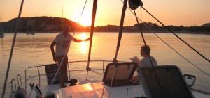 Another day with just Sue and I – lovely. We didn’t do much – swam twice, changed the sheets and aired the mattresses, shopped, updated the blog. It was very hot. Eagerly awaited the arrival of James and Rachel – always slightly nervous about how each set of guests will take to the boat and sailing .